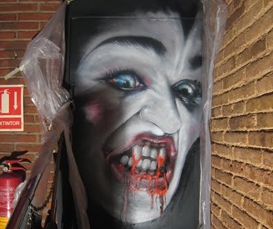 Dibujo del Conde Drácula con aspecto de Terror y sangre saliendo de la boca situado en la puerta interior del Bar.